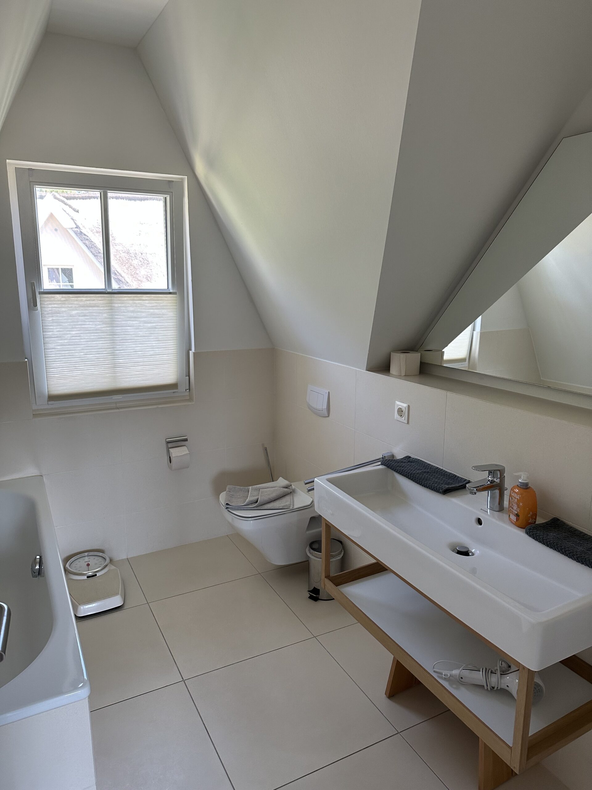 Das Bad im Obergeschoss verfügt über eine Badewanne, eine