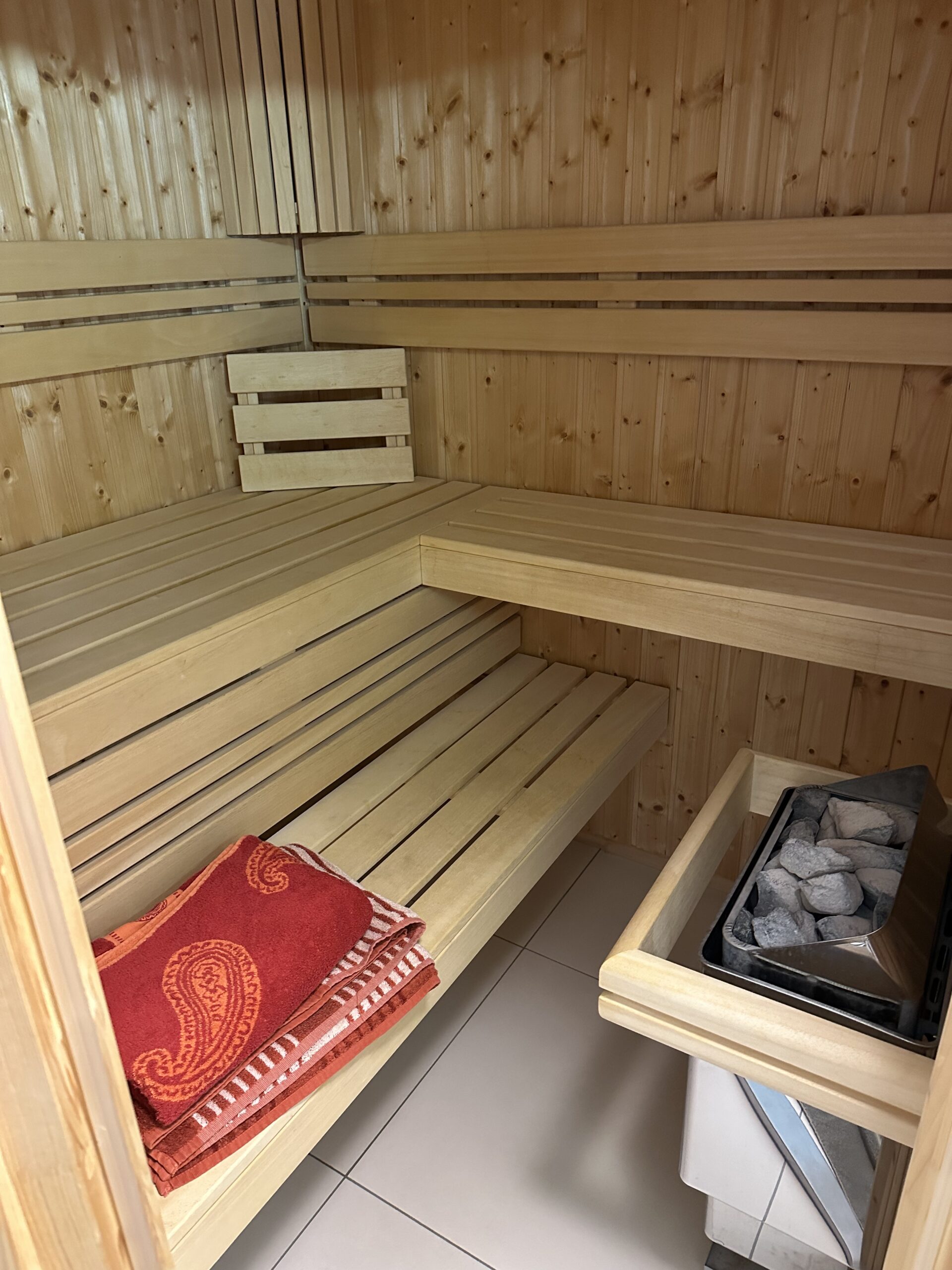 Sauna, bodengleicher Dusche und WC.